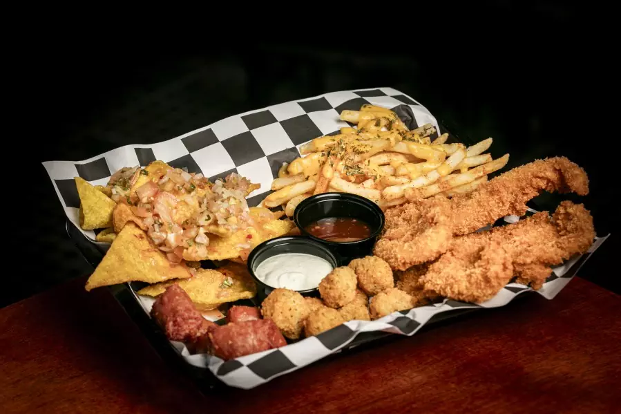 Perfecto para compartir: 5 chicken tenders, bites de chorizo, 3 mozarella sticks, papas con salsa de queso y nachos de wanton con salsa thai y pico de gallo.
