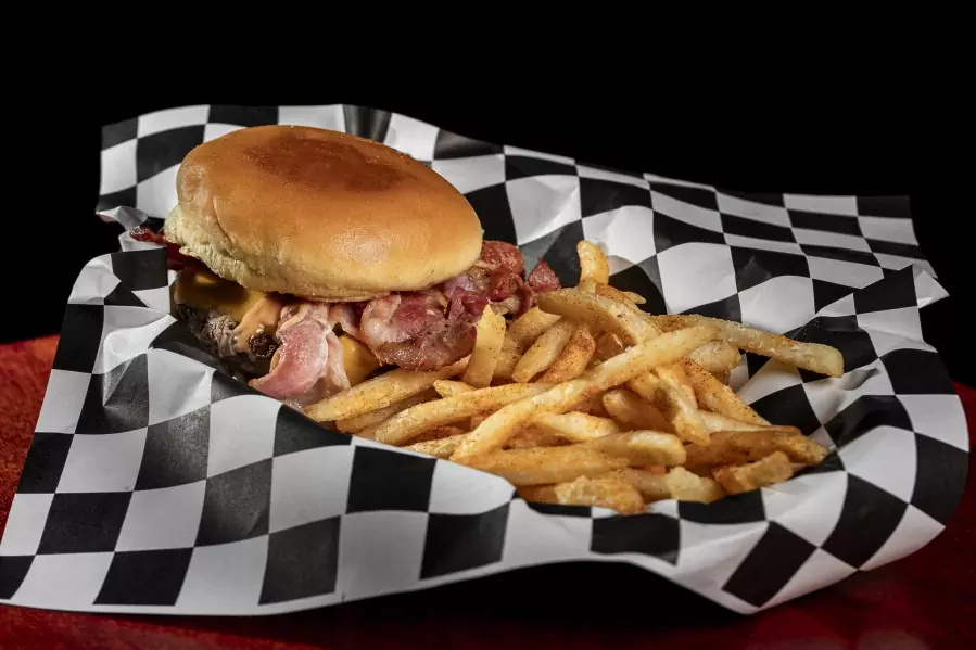 Pan, carne de la casa, queso, tocino, pepinillos y salsa BV.