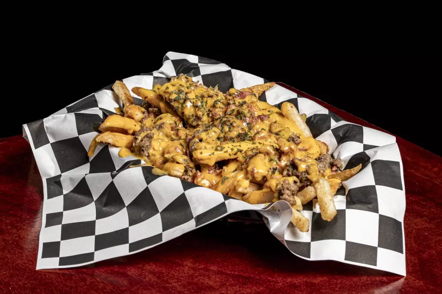 Orden de papas fritas servidas con una mezcla de carne, chorizo tableño y tocino, acompañadas de salsa de queso derretido.
