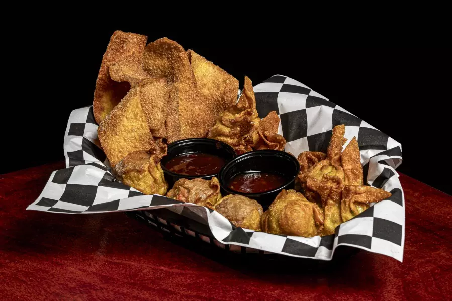 Plato combinado de Sui Mai Frito (4), wantones rellenos (4) y tiras de wantones acompaƱados con salsa agridulce y teriyaki.