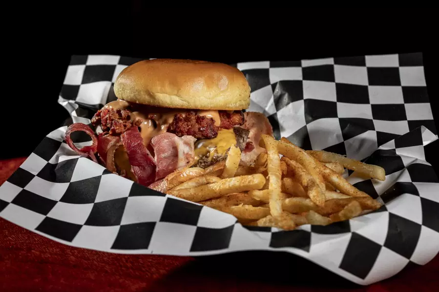 Pan, carne de la casa, queso tocino, chorizo tableño y salsa BBQ. Acompañado con papas fritas