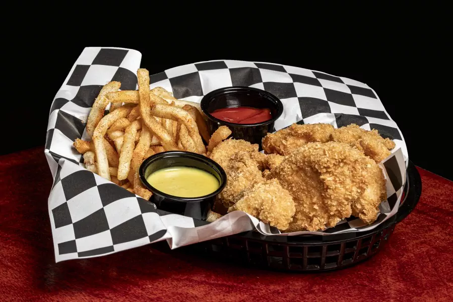 Jugosas tiras de pechuga apanadas, servidas con honey mustard de la casa y acompaƱadas con papas fritas y ketchup.