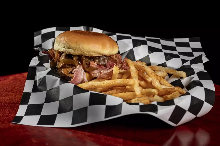 Pan brioche, carne de la casa, queso, tocino, cebolla caramelizada y salsa BBQ. AcompaƱado con papas fritas.